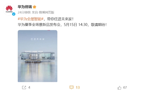 華為官宣,5 月 15 日夏季全場景發(fā)布會將帶來全屋智能新品“未來之家”。