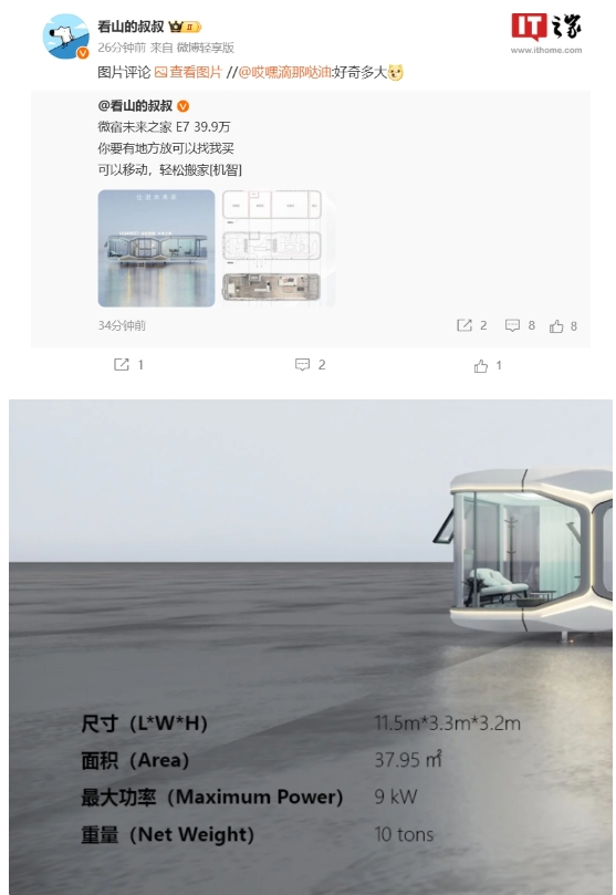 博主 @看山的叔叔 爆料,產(chǎn)品“微宿未來之家 E7”太空艙支持移動,售價在 39.9 萬元,尺寸為 11.5×3.3×3.2m,面積 37.95m²,支持 9kW 最大功率,重量 10 噸。