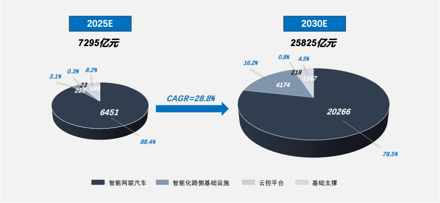 中國汽車工程學會發(fā)布的《車路云一體化智能網(wǎng)聯(lián)汽車產(chǎn)業(yè)產(chǎn)值增量預測》顯示,在中性預期情景下,預計2025年、2030年車路云一體化智能網(wǎng)聯(lián)汽車產(chǎn)業(yè)產(chǎn)值增量為7295億元、25825億元,產(chǎn)業(yè)發(fā)展將積極推動我國經(jīng)濟增長。