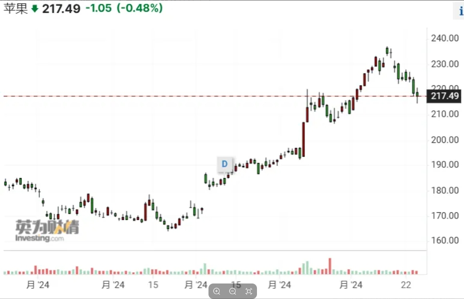 截至美股周四(7月25日)收盤(pán),蘋(píng)果下跌了0.48%,周五(7月26日)盤(pán)前,蘋(píng)果股價(jià)略微上漲。而在上周,蘋(píng)果股價(jià)刷新歷史新高。在“全球開(kāi)發(fā)者大會(huì)”(WWDC)推出“蘋(píng)果智能”以來(lái)一個(gè)月,蘋(píng)果股價(jià)持續(xù)走高。