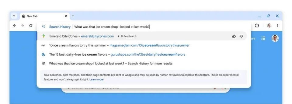例如“上周我看的那家冰淇淋店是哪家?”,Chrome 瀏覽器會顯示瀏覽歷史記錄中的相關(guān)頁面。