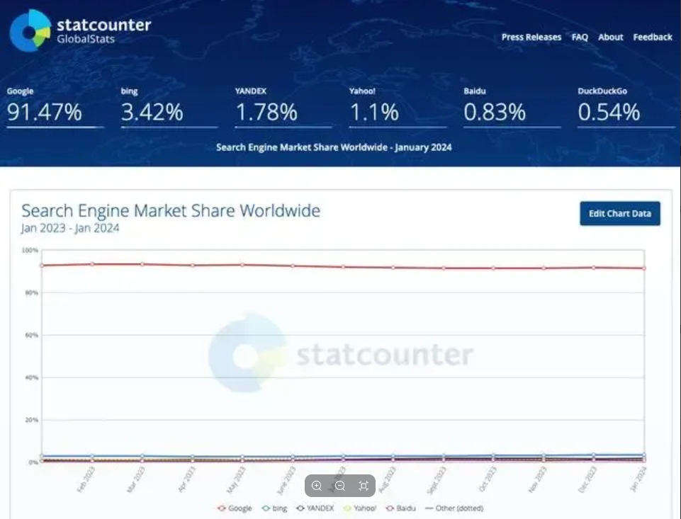 面對(duì)搜索這塊肥肉,國(guó)內(nèi)外大廠和創(chuàng)業(yè)者都虎視眈眈,OpenAI的野心也已彰顯。但是長(zhǎng)期以來(lái)谷歌占據(jù)著全球搜索引擎領(lǐng)域的霸主地位,市場(chǎng)占有率居90%以上,OpenAI能在谷歌那里分到一杯羹嗎?