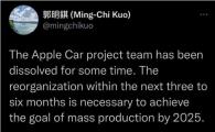 天風(fēng)國(guó)際分析師郭明錤在推特表示,此前爆料已久的蘋果 Apple Car 團(tuán)隊(duì)已經(jīng)解散了一段時(shí)間。如果想在 2025 年量產(chǎn) Apple Car,需