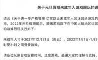 12 月 26 日消息,據(jù)騰訊游戲微信公眾號消息,騰訊游戲發(fā)布通知稱, 2022 年元旦假期前后,騰訊游戲旗下在中國大陸地區(qū)運營的網(wǎng)絡(luò)