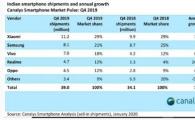 市場(chǎng)調(diào)研機(jī)構(gòu)Canalys日前發(fā)布印度手機(jī)市場(chǎng)報(bào)告,報(bào)告顯示,2019年第四季度印度智能手機(jī)市場(chǎng)增長(zhǎng)14%,總出貨量為3,900萬(wàn)臺(tái)。印度智能手
