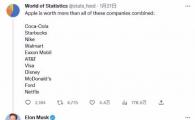 The World Of Statistics 在最新推文中表示,蘋果公司的市值已經(jīng)超過了可口可樂、耐克等 11 家藍(lán)籌公司的市值總和。隨后馬斯克轉(zhuǎn)