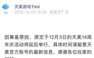 天美游戲公告,因籌備原因,原定于 12 月 3 日的天美 14 周年慶活動將延后舉行,具體時間請留意天美官方賬號的最新信息,感謝各